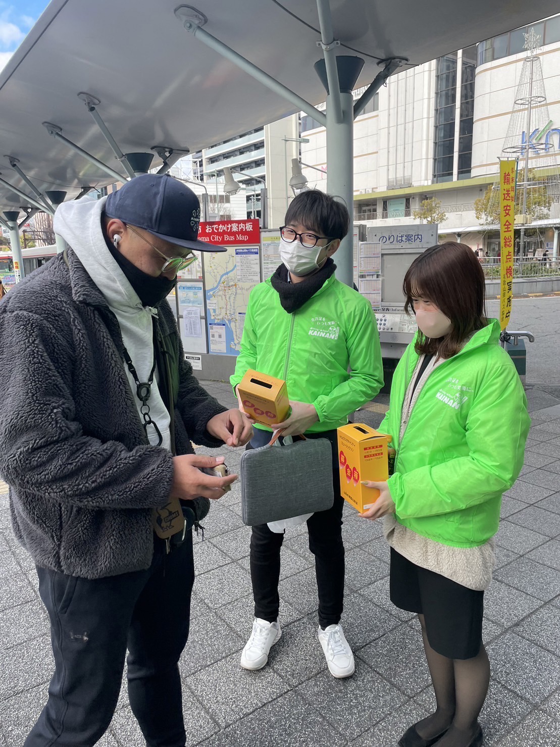12月24日(日)JR和歌山駅・近鉄百貨店前で和歌山放送さん主催、目の不自由な方へ「音の出る信号機」をコンセプトに岸指導員・山本和季指導員・橋爪事務員の3名が募金活動に参加しました😊