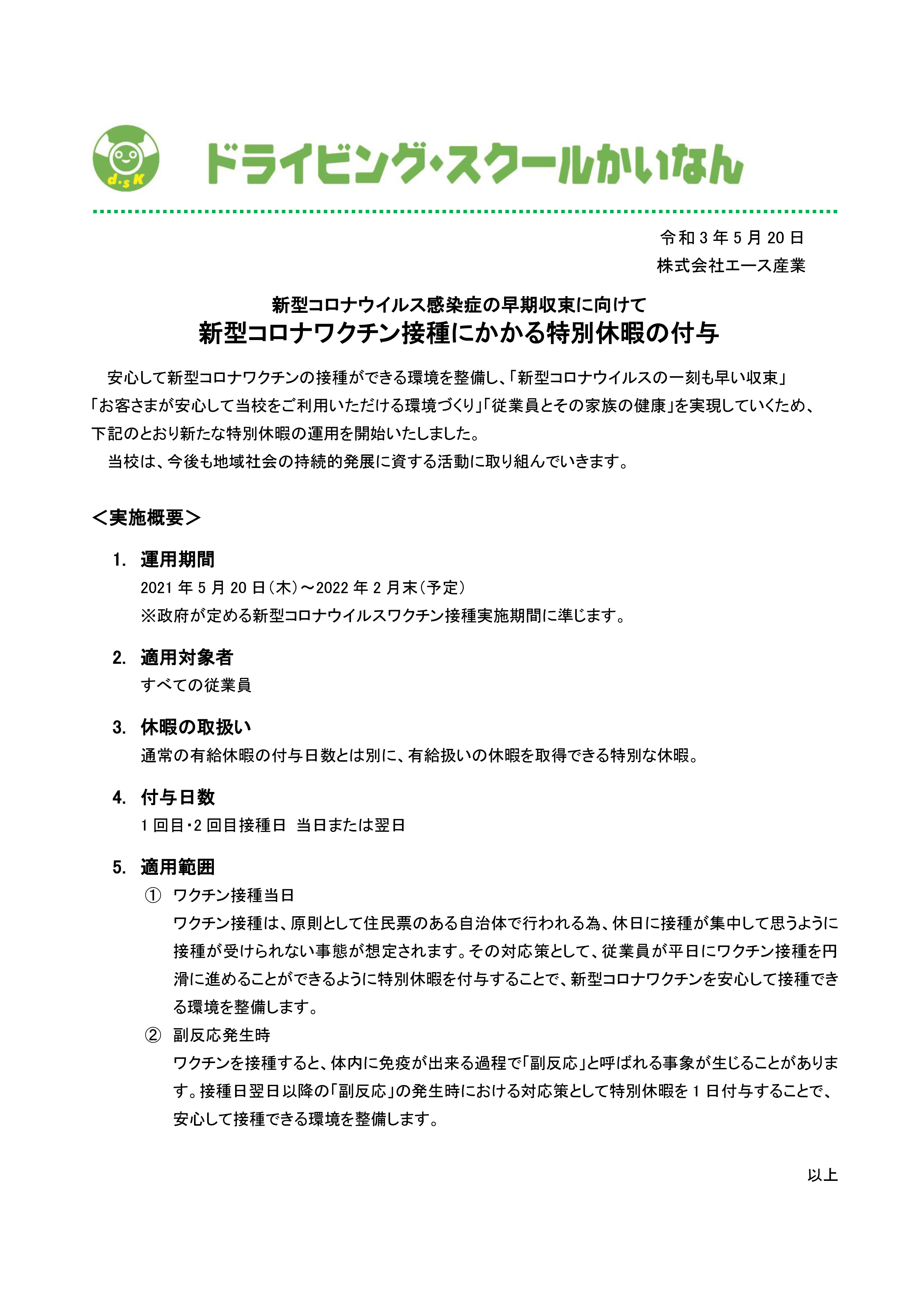 新型コロナワクチン接種にかかる特別休暇の付与に関して。