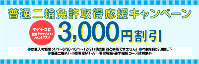 対象入校期間に普通二輪MTでご入校された方、¥3,000プライスダウン!